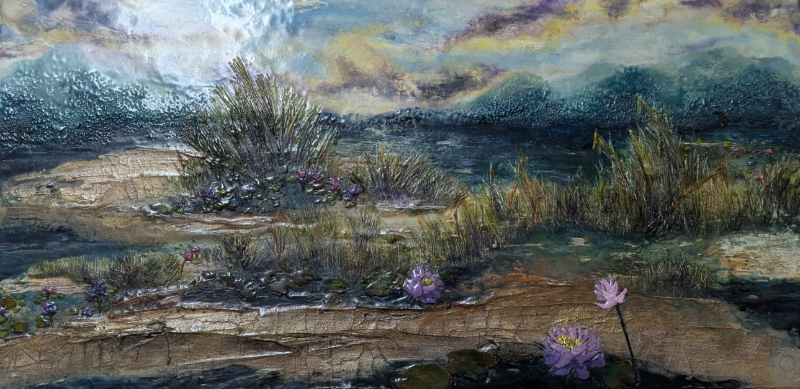 Alicia’s path to art was as unexpected as it was transformative. Four years ago, while scrolling through images on her phone, she discovered encaustic painting — an ancient medium using molten beeswax, damar resin, and pigment. It was a moment of magic that shifted her life away from a decades-long banking career and toward a deeply personal, multidisciplinary practice. Today, Alicia masterfully wields blowtorches, hot palettes, carving tools, and pigments to craft richly textured pieces that echo her rural upbringing in South Trinidad.