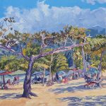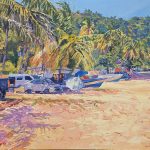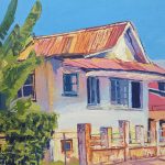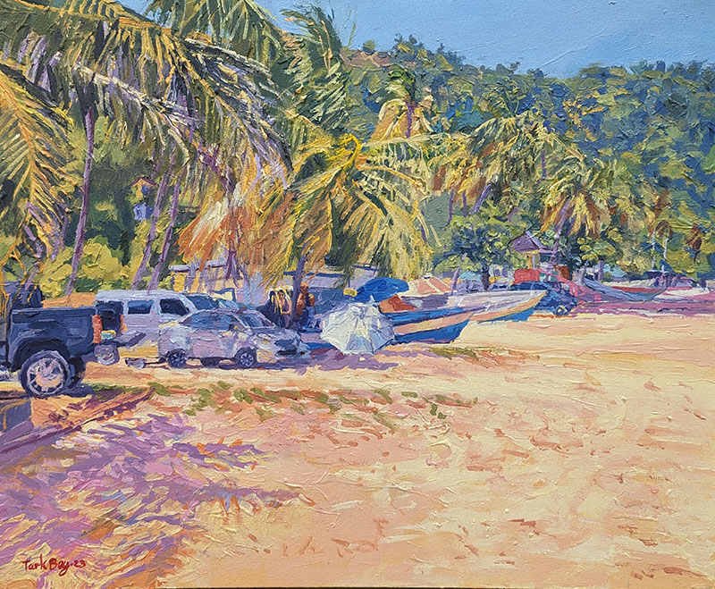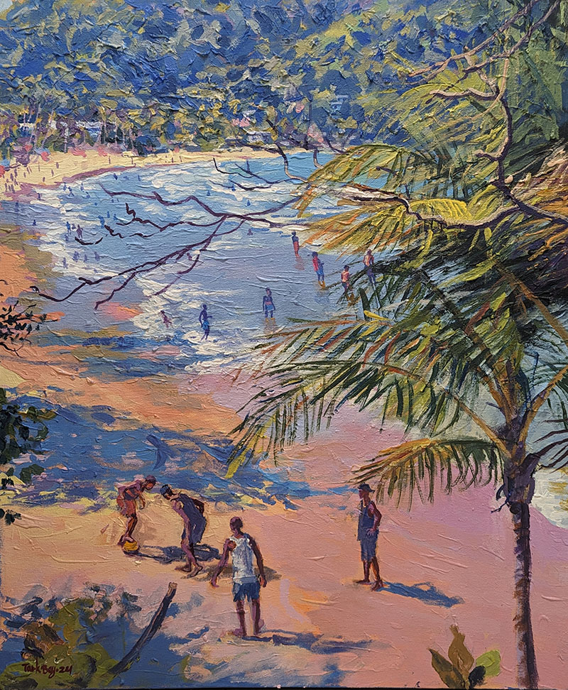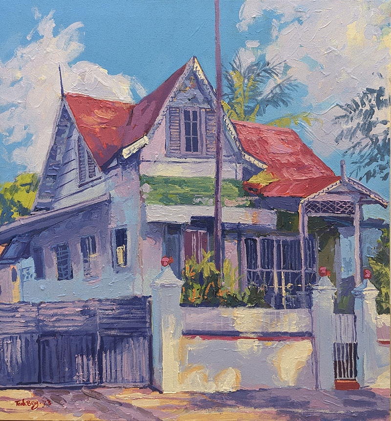 Trinidadian artist Tark Bey was born to paint! The introduction to art and painting came at a young age, as his father would often quell his tears by painting. Self-taught, he describes his style as a blend between impressionist and realism, with acrylics being his medium of choice. Drawing inspiration from nature and everyday life, his compositions include landscapes, seascapes, cultural and historical sites. However, it is his vibrant and distinct colour palette that sets him apart.